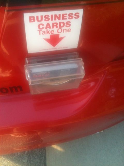 A man had not only wrapped his car in a pleasing and colorful design to advertise his car tinting business, he took his message one step further: he installed a business card holder box on the back of the trunk.